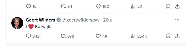Ik weet dat X een open riool is, en daarom zit ik er ook niet op. Af en toe bereikt je toch een bericht uit die gierput. Vorige week bijvoorbeeld eentje van Geert Wilders. Het was een impliciete aanmoediging tot het gebruiken van geweld: “I (hartje) Katwijk!”. Het lukte mij daarom niet er níet op te reageren.