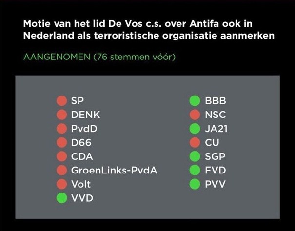 De Tweede Kamer nam vandaag een motie die Antifa aanmerkt als een terroristische organisatie. BBB, JA21, SGP, FvD, PVV en VVD stemden voor deze motie.