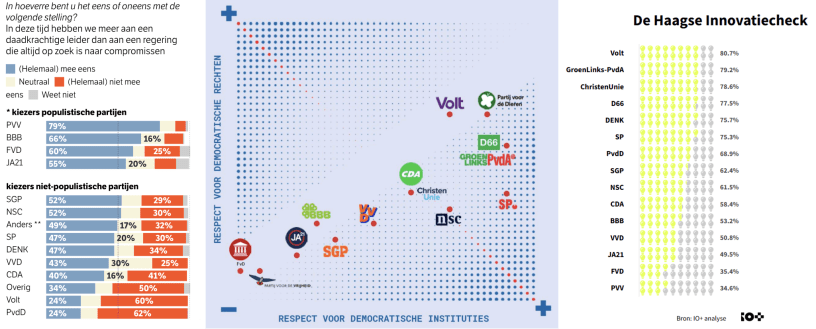 Wat hebben deze drie grafieken gemeen? Ze laten vooral zien dat een groot deel van de politieke partijen én bereid is de democratie in de prullenbak te smijten én niet zo veel heeft met vernieuwing. En als uitsmijter blijkt hun achterban wel toe aan een autocratische leider die orde op zaken komt stellen.