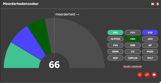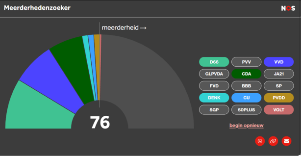 De VVD appel is dan ook verrot met slechts een spaarzaam aantal melige, nog net eetbare, stukjes. Hoewel Rutte tenminste nog had geleerd van zijn eigen blunder van (P)Rutte I heeft Yesilgöz dat evident niet. Niet alleen ging de VVD onder haar bezielende leiding een tweede samenwerking aan met de PVV, maar ze wil nu zelfs een samenwerking met een partij die net zo amateuristisch, discriminatoir en illiberaal is als de PVV. Want ‘Yeslissgöz’ offert zonder schroom het laatste beetje liberaal erfgoed van de VVD op om aan de macht te komen, zolang dat is op haar voorwaarden en haar voorwaarden alleen. Dat ze daarmee bewust de kans op een kansrijk meerderheidskabinet verruilt voor een tot opnieuw tot falen gedoemde gedoogconstructie maakt niet uit, want de VVD heeft immers nog een paar zetels over en kan dus best in goed Amsterdams nog eens plat op haar bek gaan. Dat ook CDA-leider Bontenbal een coalitie met JA21 recent nog het “meest realistische scenario” noemde, mede omdat de VVD GroenLinks-PvdA blijft uitsluiten, bewijst niet dat Yeslisgöz beschikt over kundigheid of inzicht, maar slechts dat Bontenbal, ondanks zijn praatjes over fatsoen en het streven om de politiek te ontdoen van populistische partijen en te normaliseren, net zo’n schertsfiguur is als zij. Jetten houdt vooralsnog zijn rug recht, maar de vraag is hoelang dat haalbaar blijft. Ik hoop tegen beter weten in dat hij volhoudt en Yesslisgöz door de (niet bij haar aanwezige) knieën gaat dan wel dat de VVD haar alsnog de laan uitstuurt. Ik vrees echter dat de wens de vader is van die gedachte, en dat D’66 overstag gaat of Nederland een zeer langdurig formatietraject ingaat. D’66, CDA en VVD hebben immers 66 zetels en zijn dus aangewezen op gedoogsteun of een vierde partij voor een meerderheid. Yeşilgöz blijft hameren op JA21 als gedoogpartner of coalitiegenoot – dat noemt ze consequent haar voorkeur voor een “centrumrechts” kabinet. Maar ook met JA21 erbij komt men dan niet aan een meerderheid (figuur 1).